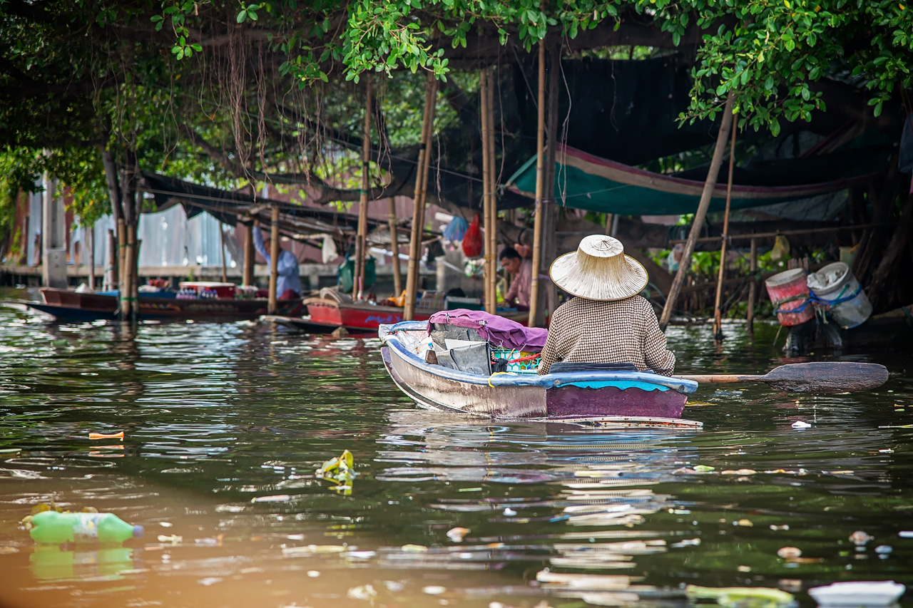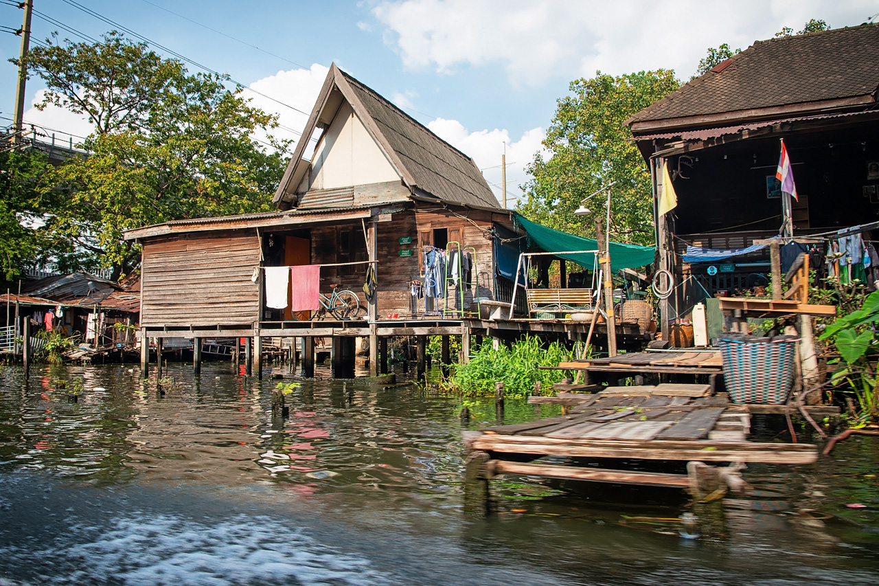 Nach dem Besuch der Tempelanlage ging es mit dem Tuk-Tuk an den Chao Phraya. Dort steigen wir in ein Boot um uns die berühmten schwimmenden Märkte anzuschauen. Das ist allerdings eine ziemliche Pleite, da wir nur drei Boote zu Gesicht bekommen, die versuchen Touriartiken an den Mann/die Frau zu bringen. Vielleicht lag es daran, dass es Sonntag war und daher die anderen Händler nicht unterwegs waren. Allerdings ist die Fahrt durch die kleinen Kanäle trotzdem sehr interessant. Man sieht Licht und Schatten dieser Stadt. Von immensem Prunk in den Tempeln zu bitterer Armut in den kleinen, oft baufälligen Hütten am Rand der Kanäle. Außerdem viel Umweltverschmutzung im Wasser und zu Lande: