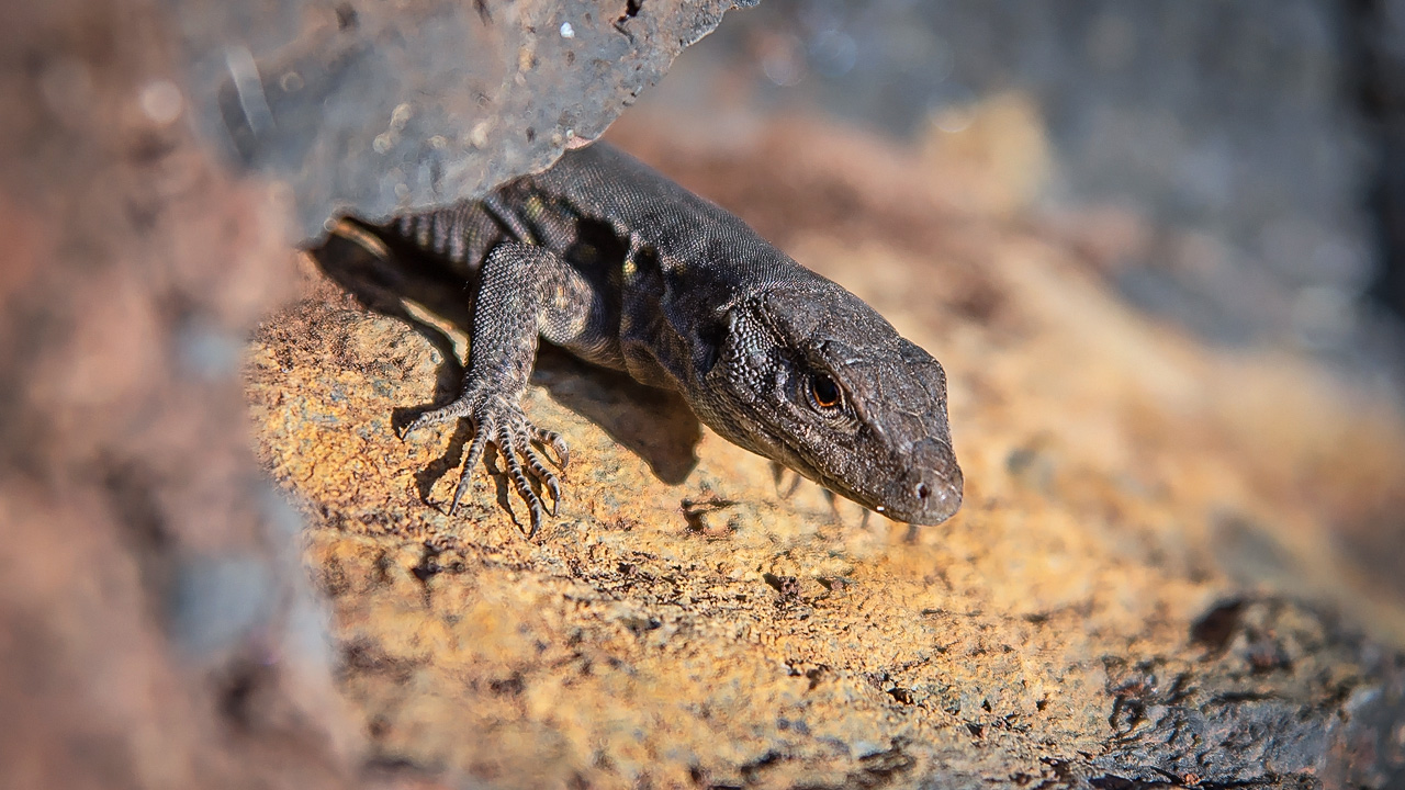 Ein Gecko schaut aus einer Mauerspalte hervor: