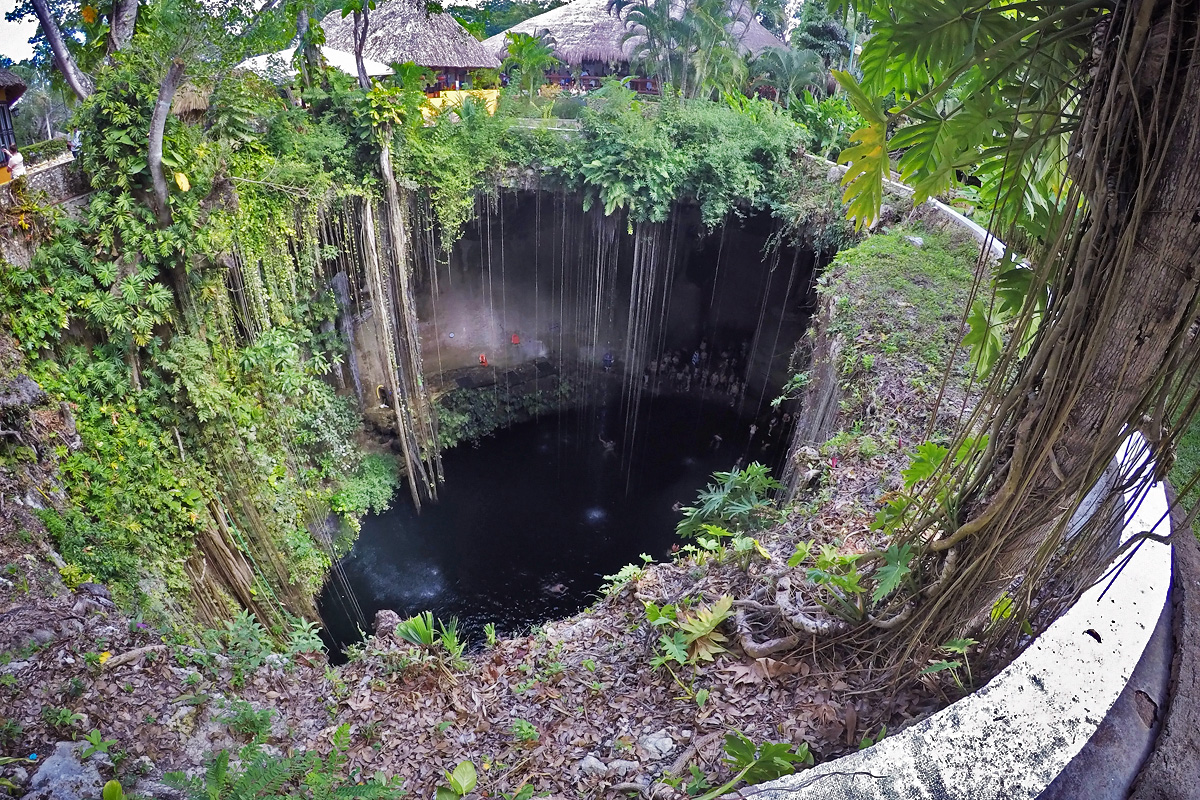 Danach ging es mit dem Bus weiter zu einer Cenote ganz in der Nähe. Cenoten sind tiefe mit Wasser gefüllte Löcher. Gespeist werden die Cenoten durch unterirdische Flüsse, die dieses Gebiet durchziehen. Entstanden sind die Cenoten dadurch, dass die unterirdischen Flüsse den Boden ausgespült haben und so große Hohlräume entstanden sind. Später sind die Deckschichten über diesen Höhlen eingestürzt und die Löcher sind geblieben. In den Cenoten kann man schwimmen, was wir jedoch nicht taten: