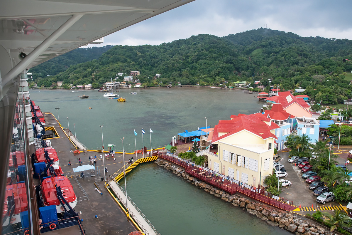 Blick vom Balkon unserer Kabine auf Roatán