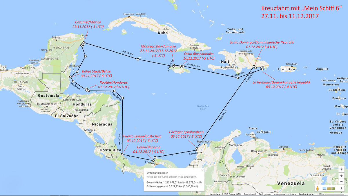 Gegen 12 Uhr ging es von Düsseldorf aus über den großen Teich. Aufgrund starken Gegenwindes dauerte der Flug über 11 Stunden, so das wir gegen 17:30 Uhr (Ortszeit) in Montego Bay landeten. Nach dem Transfer zum Schiff und der obligatorischen Seenotrettungsübung (21 Uhr) legte unser Schiff gegen 23 Uhr ab.
