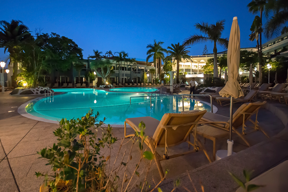 ADRIAN Hotels Colón Guanahani. Blick auf den Pool über den Dächern von Costa Adeje: