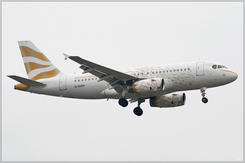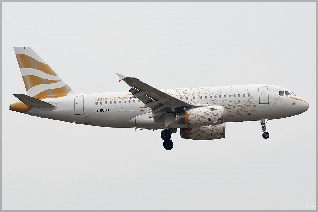 British Airways hat aus Anlass der olympischen Spiele in London mehrere Flugzeuge mit einer Sonderlackierung versehen. Am 05.04.2012 war die "golgende Taube" erstmals in Düsseldorf.