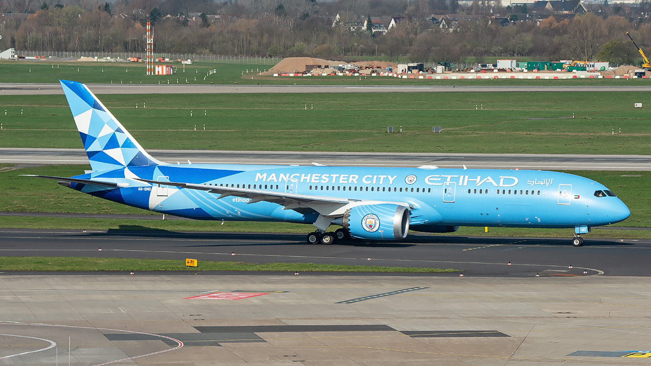 Dann rollte der Etihad Dreamliner mit der Sonderlackierung vom englischen Fußballclub Manchester City zum Start: