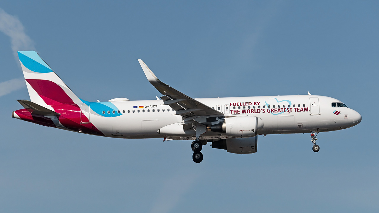 Seit ein paar Tagen fliegt ein Flieger von Eurowings in einer Lackierung die EW seinen Mitarbeitern gewidmet hat. Auf der linken Seite trägt er die Aufschrift "Was mich antreibt? Das beste Team der Welt.", auf der rechten Seite die Aufschrift "Fuelled by the world's greatest Team." Heute präsentierte der Fieger seine rechte Seite im Anflug auf die 05R. Zunächst aber noch ein paar andere Flieger: