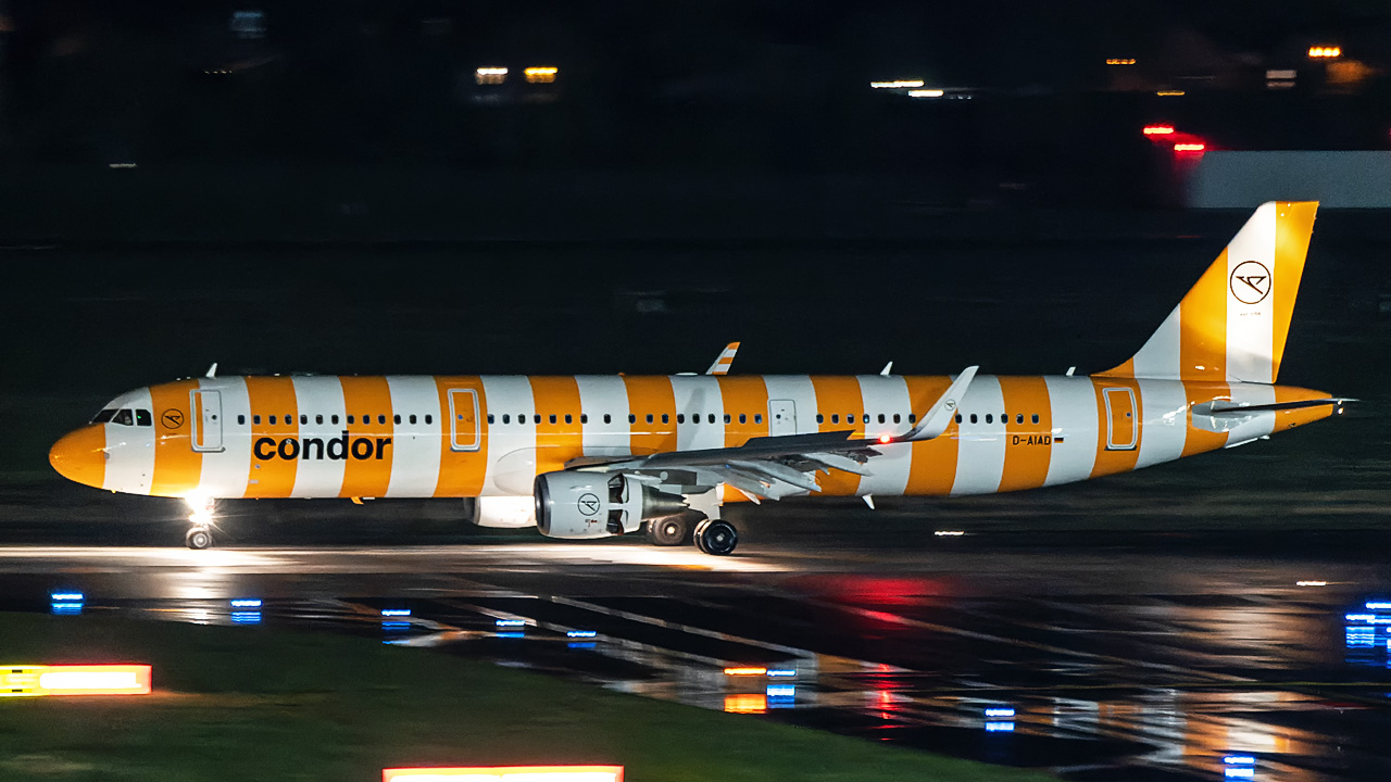 Am Abend bin ich noch mal kurz zum Platz gefahren. Condor hat vor ein paar Tagen das neue Firmen-Design vorgestellt. Zunächst dachte ich an einen verspäteten Aprilscherz, aber die meinen das ernst! "Condor steht für Urlaub. Und Urlaub ist gestreift.", so kann man auf der Firmenseite lesen. Und weiter: "Sonnenschirme, Badetücher, Eisdielen... Wer liebt sie nicht, die Gute-Laune-Streifen? Sie stehen für Leichtigkeit, die Freiheit, die Welt zu erleben, für die sanfte Meeresbrise im Haar, die Sonnenstrahlen auf der Haut und ab sofort auch für uns. Denn künftig tragen auch wir sie, inklusive unserer Flotte! Streifen sind ein Lebensgefühl.". Naja, man muss sich wohl erst noch dran gewöhnen. Heute war jedenfalls der erste Flieger mit Streifen am DUS, leider erst nach 23 Uhr. Die Maschinen von Condor wird es zukünftig in fünf verschieden Streifenfarben geben: