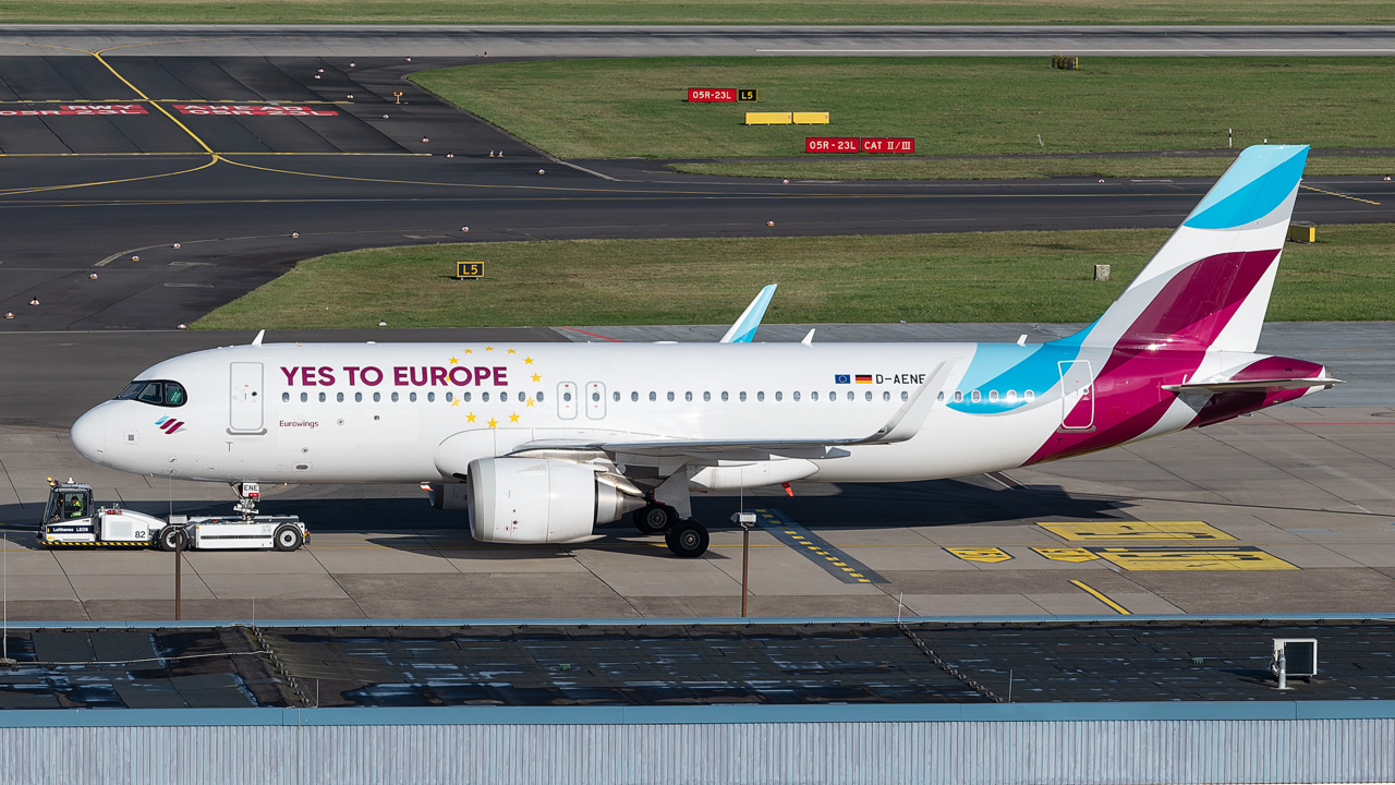 Als erstes wurde Eurowings mit "Yes to Europe"-Titel zum Gate geschleppt. Die Maschine wurde anlässlich der